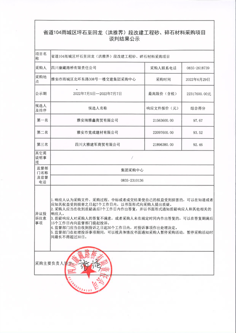 四川康藏路橋有限責任公司省道104雨城區(qū)坪石至回龍(洪雅界)段改建工程砂、碎石材料采購項目談判結果公示