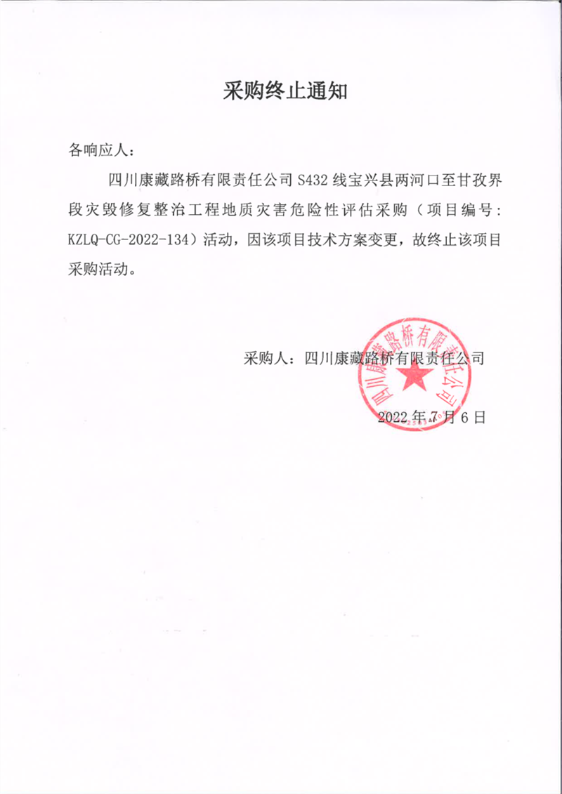 四川康藏路橋有限責任公司S432線寶興縣兩河口至甘孜界段災(zāi)毀修復(fù)整治工程地質(zhì)災(zāi)害危險性評估采購終止通知