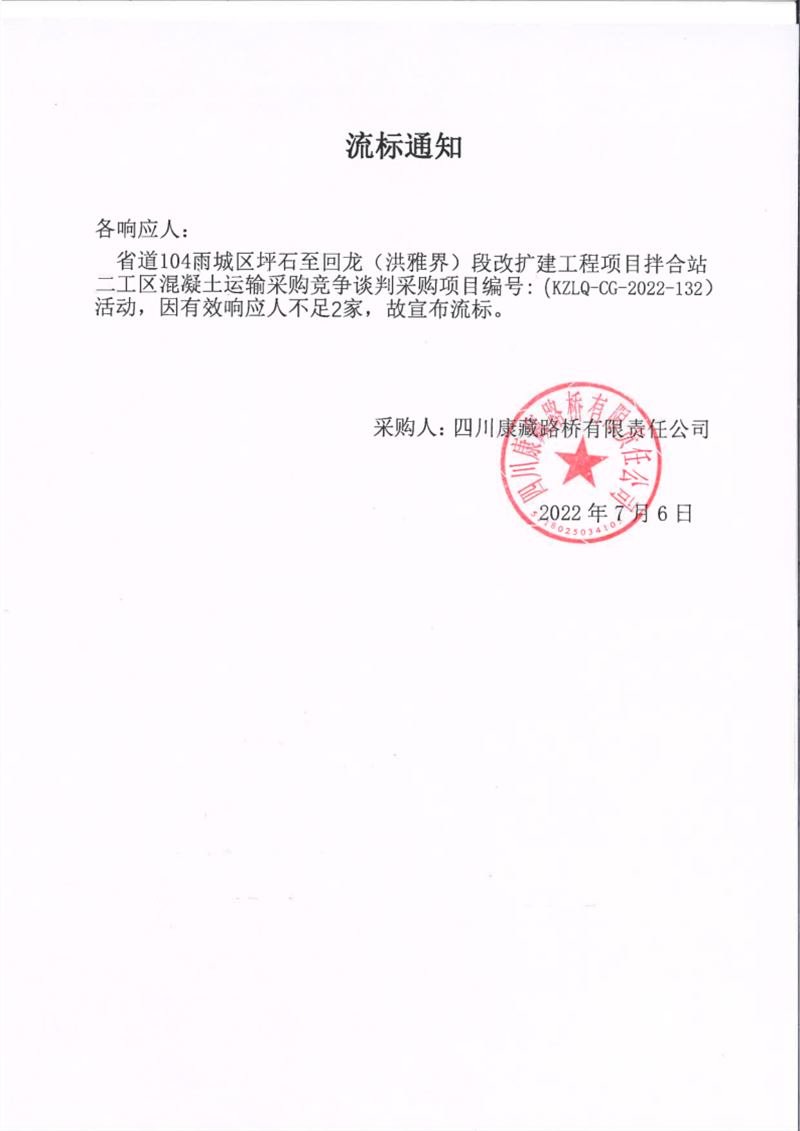 四川康藏路橋有限責(zé)任公司省道104線雨城區(qū)坪石至回龍(洪雅界)段改建工程項(xiàng)目拌合站二工區(qū)混凝土運(yùn)輸采購競爭談判采購項(xiàng)目流標(biāo)通知
