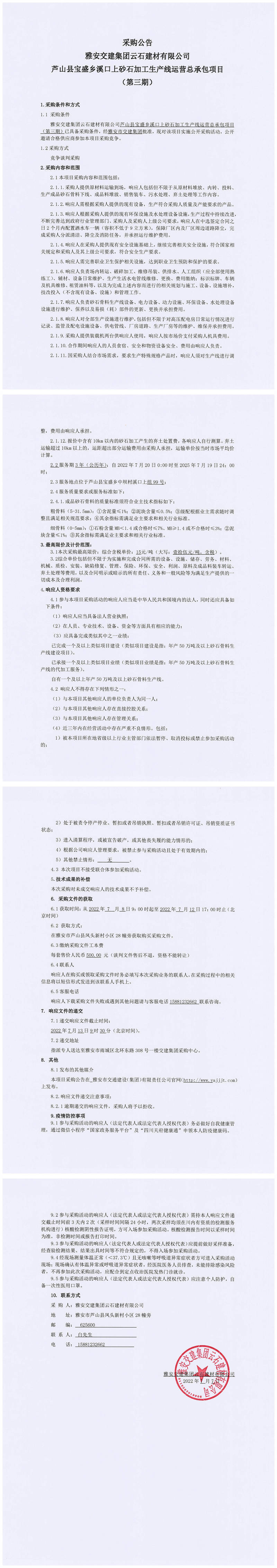 雅安交建集團(tuán)云石建材有限公司蘆山縣寶盛鄉(xiāng)溪口上砂石加工生產(chǎn)線運營總承包項目(第三期)采購公告
