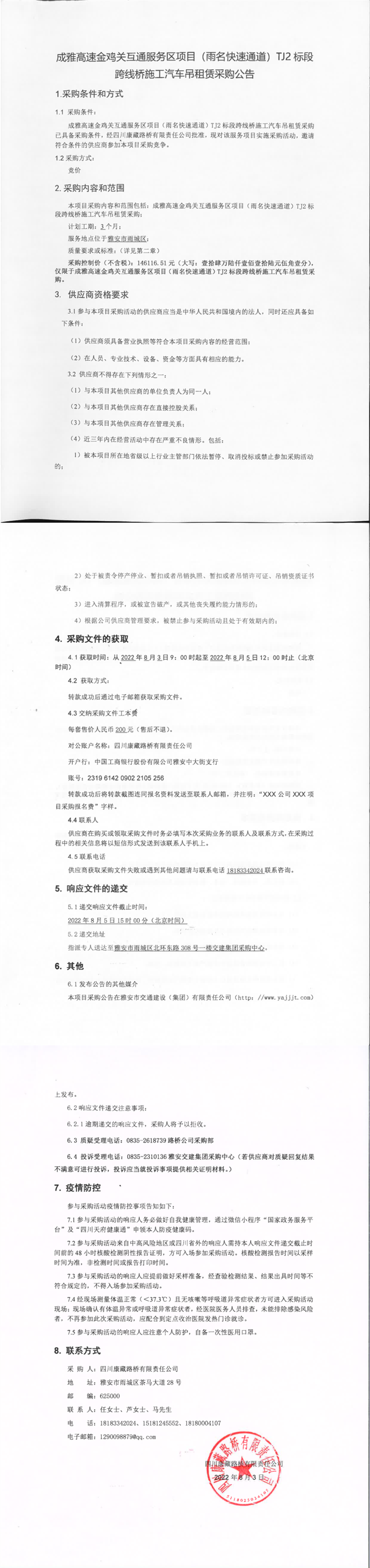 四川康藏路橋有限責(zé)任公司成雅高速金雞關(guān)互通服務(wù)區(qū)項(xiàng)目(雨名快速通道)TJ2標(biāo)段跨線橋施工汽車吊租賃采購(gòu)公告