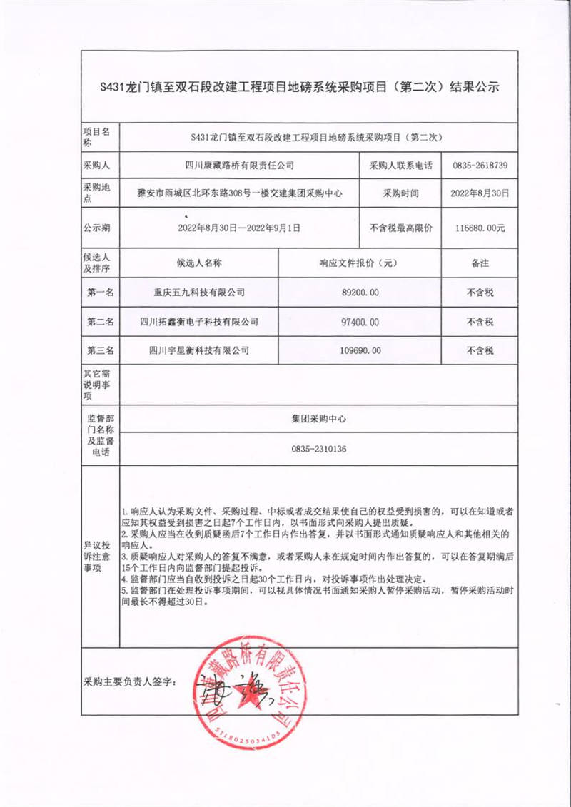 四川康藏路橋有限責(zé)任公司S431龍門鎮(zhèn)至雙石段改建工程項(xiàng)目地磅系統(tǒng)采購(gòu)項(xiàng)目(第二次)結(jié)果公示