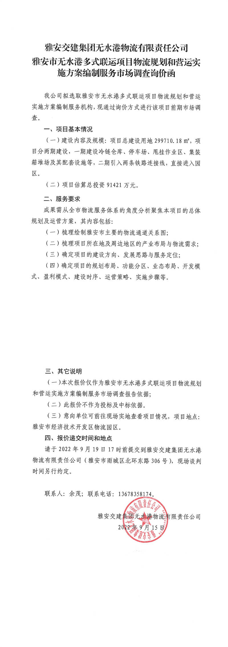 雅安交建集團(tuán)無水港物流有限責(zé)任公司雅安市無水港多式聯(lián)運(yùn)項(xiàng)目物流規(guī)劃和營運(yùn)實(shí)施方案編制服務(wù)市場(chǎng)調(diào)查詢價(jià)函