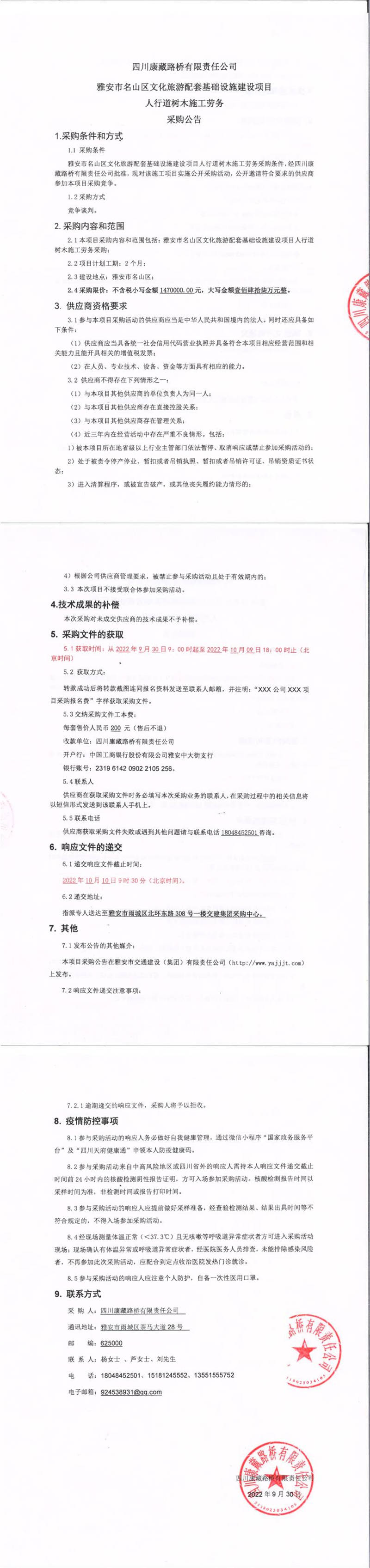 四川康藏路橋有限責(zé)任公司雅安市名山區(qū)文化旅游配套基礎(chǔ)設(shè)施建設(shè)項(xiàng)目人行道樹木施工勞務(wù)采購(gòu)公告