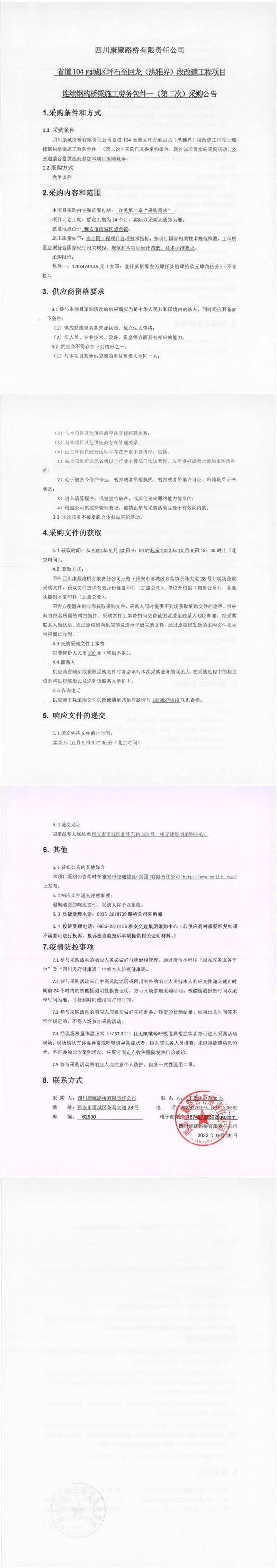 四川康藏路橋有限責(zé)任公司省道104雨城區(qū)坪石至回龍(洪雅界)段改建工程項目連續(xù)鋼構(gòu)橋梁施工勞務(wù)包件一(第二次)采購公告