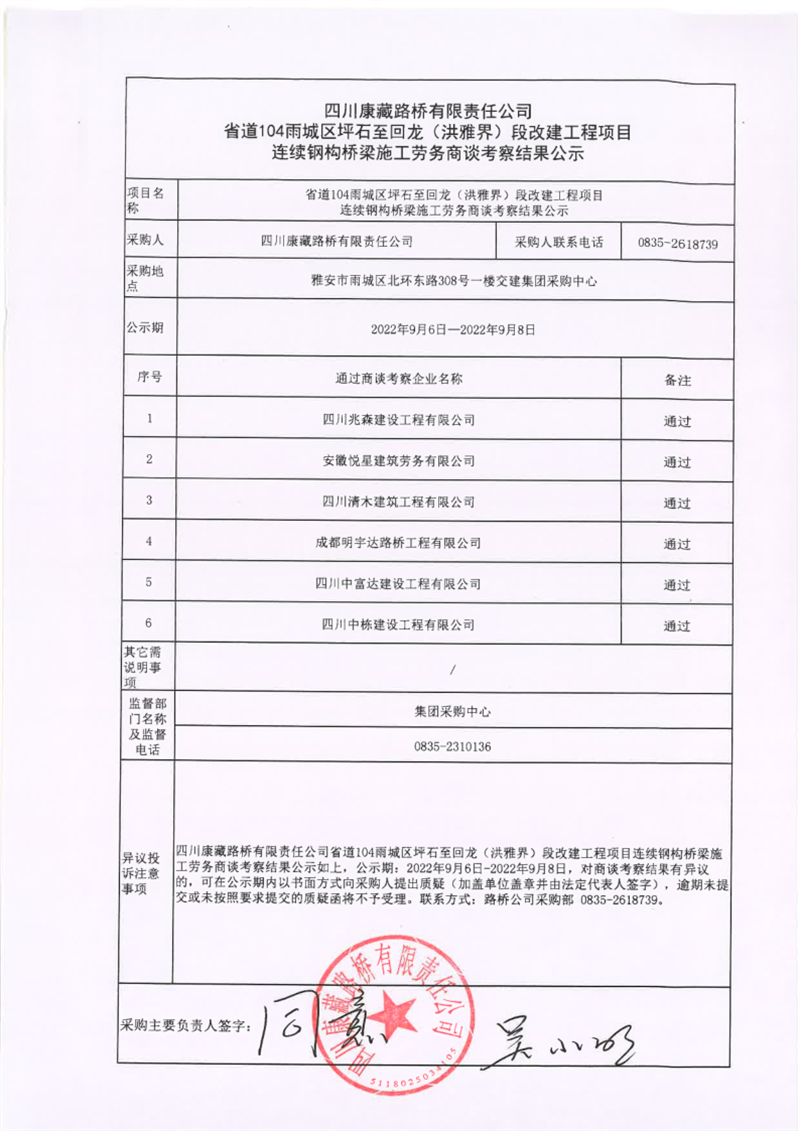 四川康藏路橋有限責任公司省道104雨城區(qū)坪石至回龍(洪雅界)段改建工程項目連續(xù)鋼構橋梁施工勞務商談考察結果公示