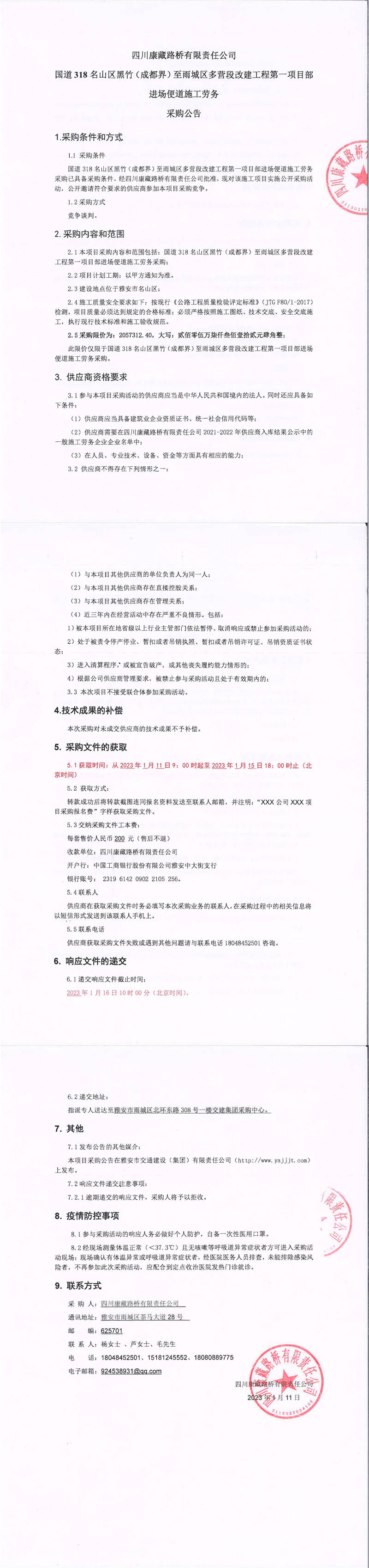 四川康藏路橋有限責任公司S431蘆山縣龍門至雙石段改建工程項目邊坡防護工程施工勞務采購競爭談判結果公示