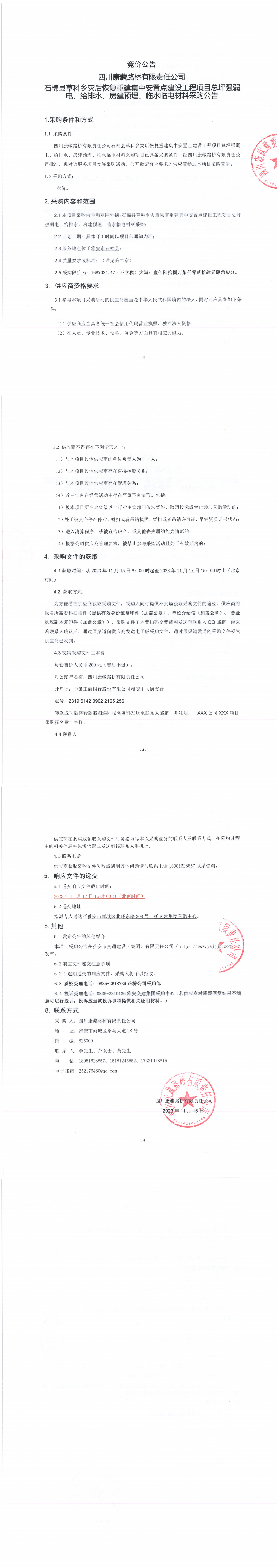 四川康藏路橋有限責(zé)任公司石棉縣草科鄉(xiāng)災(zāi)后恢復(fù)重建集中安置點(diǎn)建設(shè)工程項目總坪強(qiáng)弱電、給排水、房建預(yù)埋、臨水臨電材料采購公告