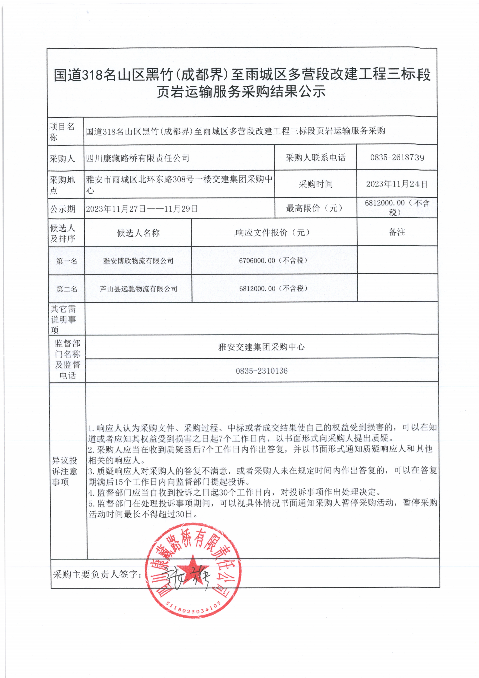 四川康藏路橋有限責任公司國道318名山區(qū)黑竹(成都界)至雨城區(qū)多營段改建工程三標段頁巖運輸服務(wù)采購結(jié)果公示