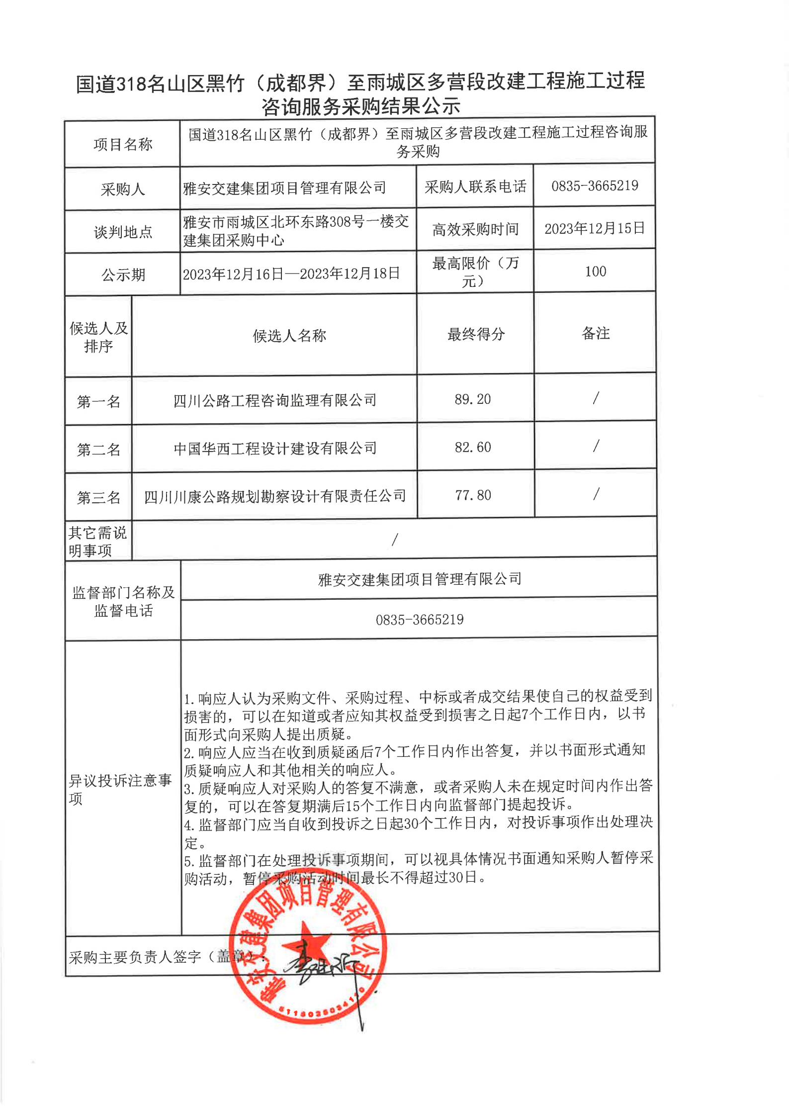 雅安交建集團項目管理有限公司國道318名山區(qū)黑竹(成都界)至雨城區(qū)多營段改建工程施工過程咨詢服務采購結果公示