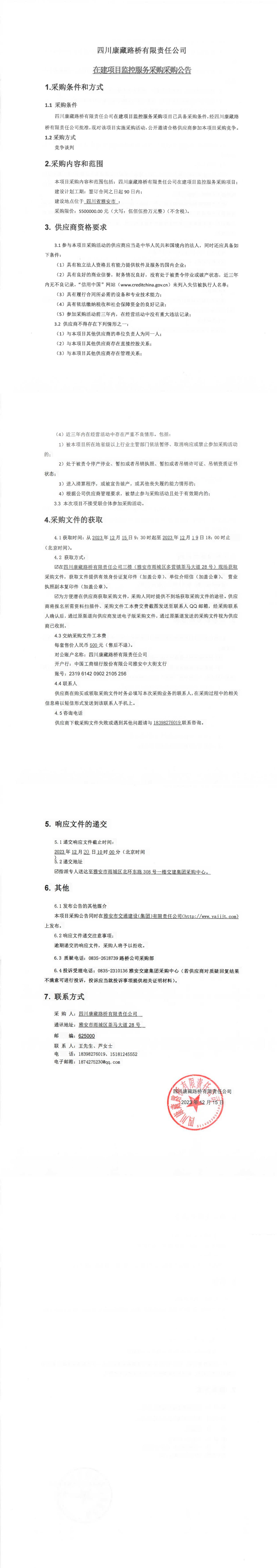 四川康藏路橋有限責任公司在建項目監(jiān)控服務(wù)采購公告