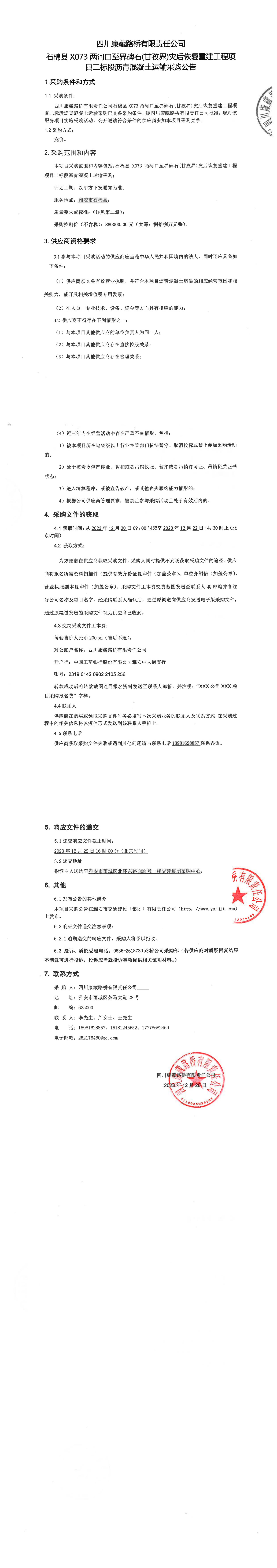 四川康藏路橋有限責(zé)任公司石棉縣X073兩河口至界碑石(甘孜界)災(zāi)后恢復(fù)重建工程項目二標(biāo)段瀝青混凝土運輸采購公告