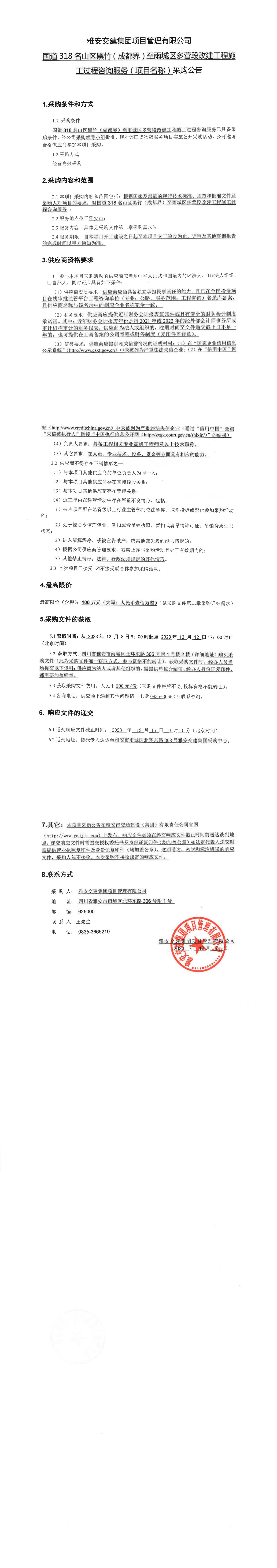 雅安交建集團(tuán)項(xiàng)目管理有限公司國道318名山區(qū)黑竹(成都界)至雨城區(qū)多營段改建工程施工過程咨詢服務(wù)(項(xiàng)目名稱)采購公告
