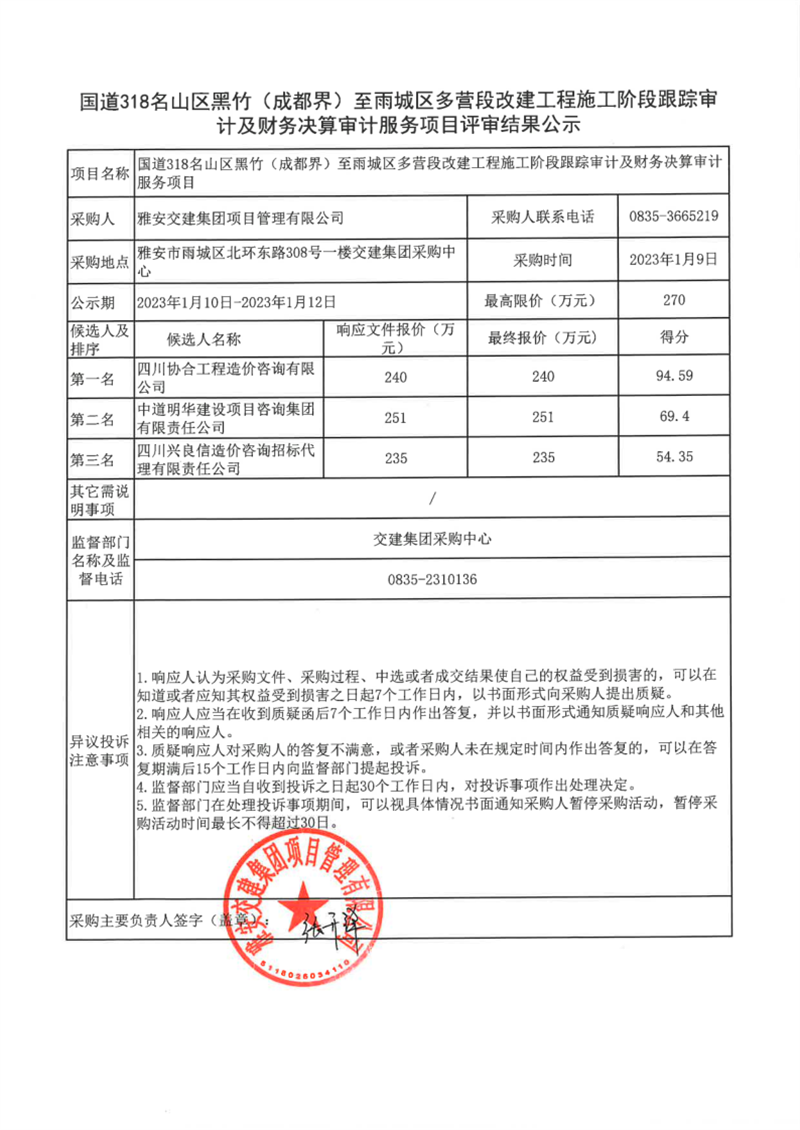 雅安交建集團項目管理有限公司國道318名山區(qū)黑竹(成都界)至雨城區(qū)多營段改建工程施工階段跟蹤審計及財務決算審計服務項目評審結(jié)果公示