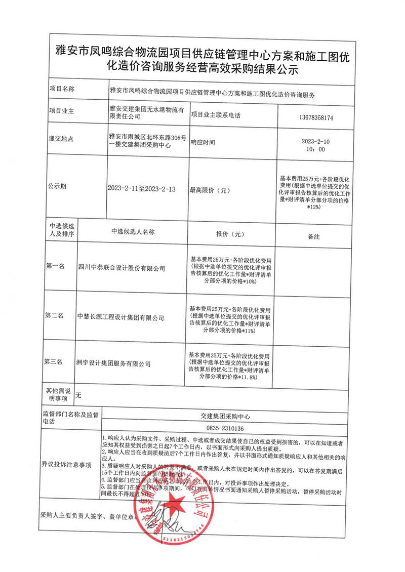 雅安交建集團無水港物流有限責任公司雅安市鳳鳴綜合物流園項目供應(yīng)鏈管理中心方案和施工圖優(yōu)化造價咨詢服務(wù)經(jīng)營高效采購結(jié)果公示