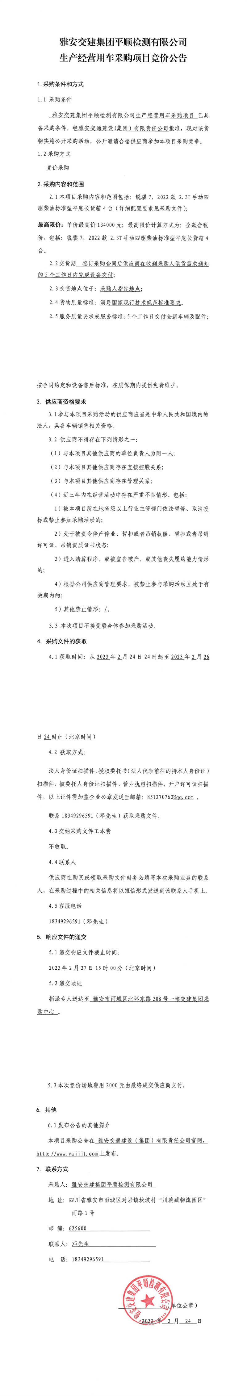 雅安交建集團(tuán)平順檢測有限公司生產(chǎn)經(jīng)營用車采購項(xiàng)目競價公告