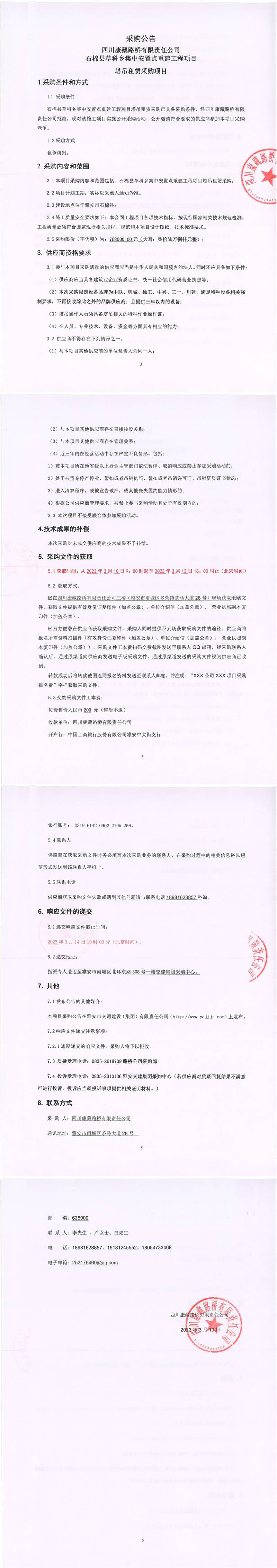 四川康藏路橋有限責(zé)任公司石棉縣草科鄉(xiāng)集中安置點(diǎn)重建工程項目塔吊租賃采購公告
