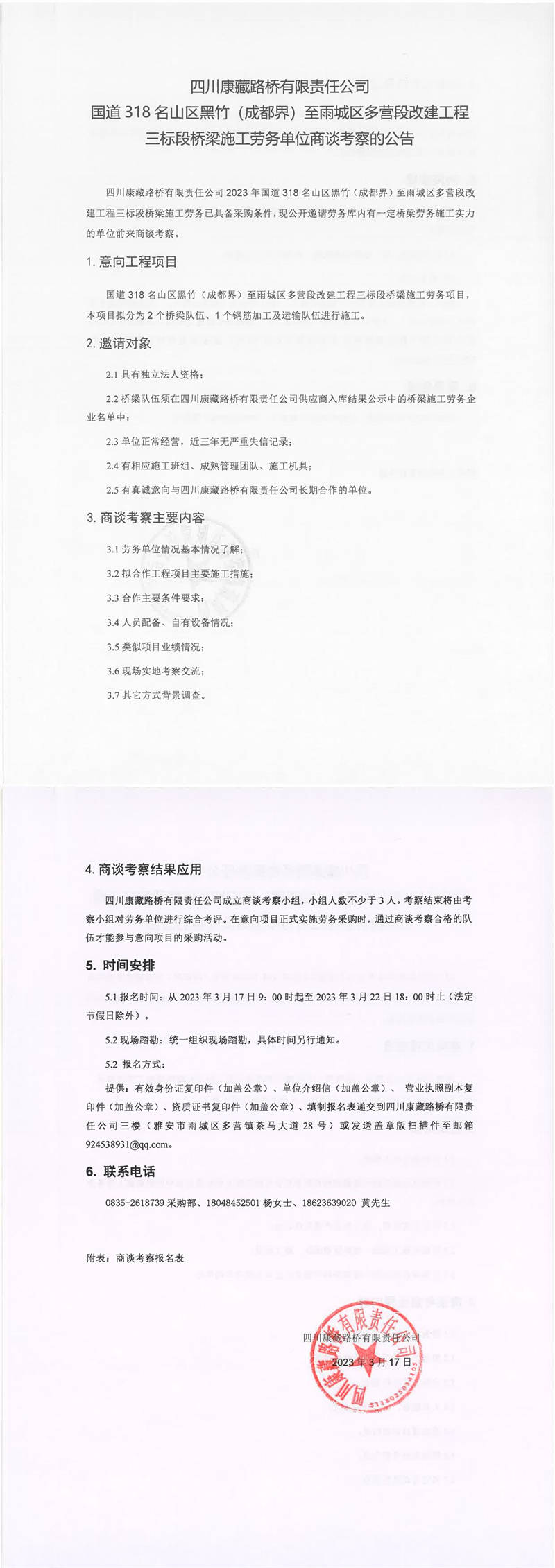 四川康藏路橋有限責(zé)任公司國(guó)道318名山區(qū)黑竹(成都界)至雨城區(qū)多營(yíng)段改建工程三標(biāo)段橋梁施工勞務(wù)單位商談考察的公告