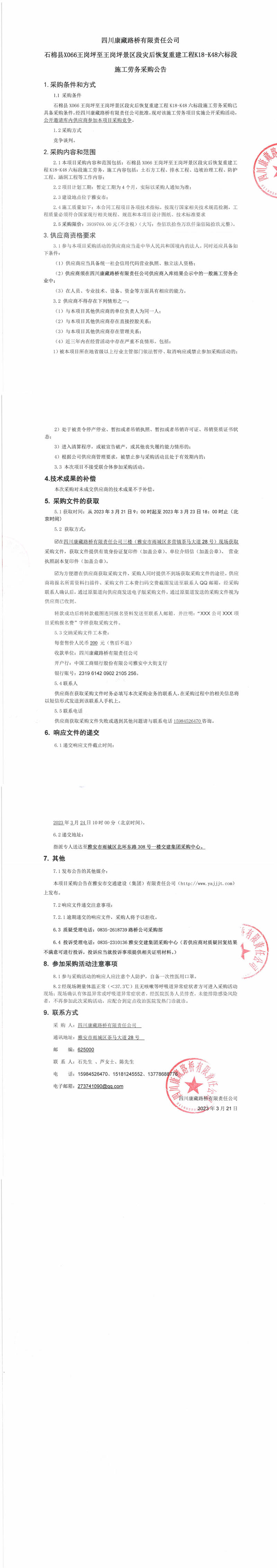 四川康藏路橋有限責任公司石棉縣X066王崗坪至王崗坪景區(qū)段災后恢復重建工程K18-K48六標段施工勞務(wù)采購公告