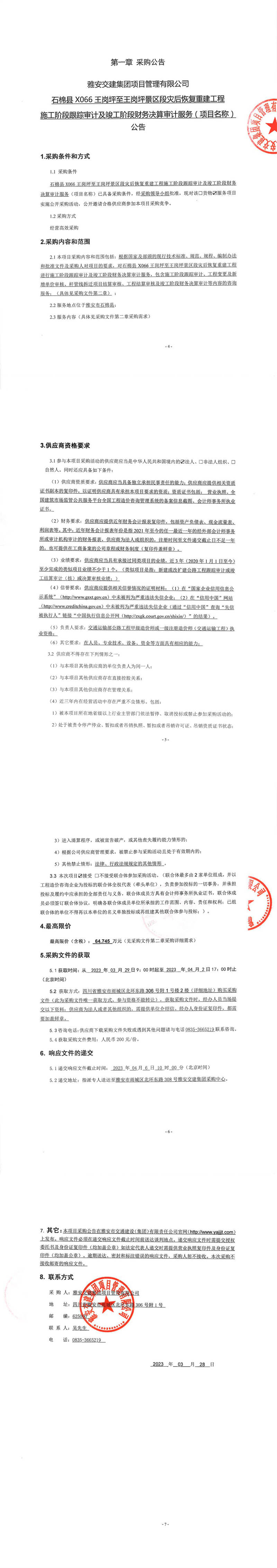 雅安交建集團(tuán)項(xiàng)目管理有限公司石棉縣X066王崗坪至王崗坪景區(qū)段災(zāi)后恢復(fù)重建工程施工階段跟蹤審計(jì)及竣工階段財(cái)務(wù)決算審計(jì)服務(wù)(項(xiàng)目名稱(chēng))公告