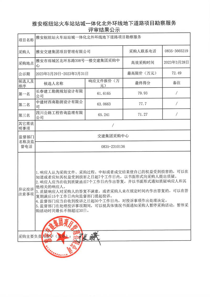 雅安交建集團(tuán)項(xiàng)目管理有限公司雅安樞紐站火車站站城一體化北外環(huán)線地下道路項(xiàng)目勘察服務(wù)評審結(jié)果公示