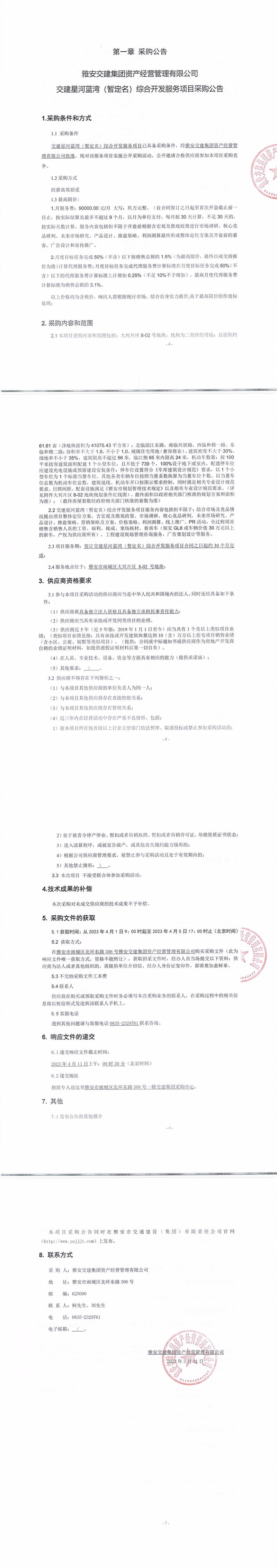 雅安交建集團資產(chǎn)經(jīng)營管理有限公司交建星河藍(lán)灣(暫定名)綜合開發(fā)服務(wù)項目采購公告