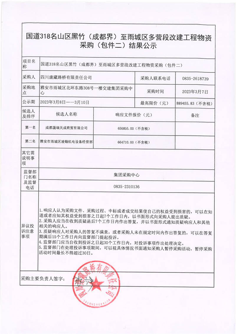 四川康藏路橋有限責(zé)任公司國道318名山區(qū)黑竹(成都界)至雨城區(qū)多營段改建工程物資采購(包件二)結(jié)果公示