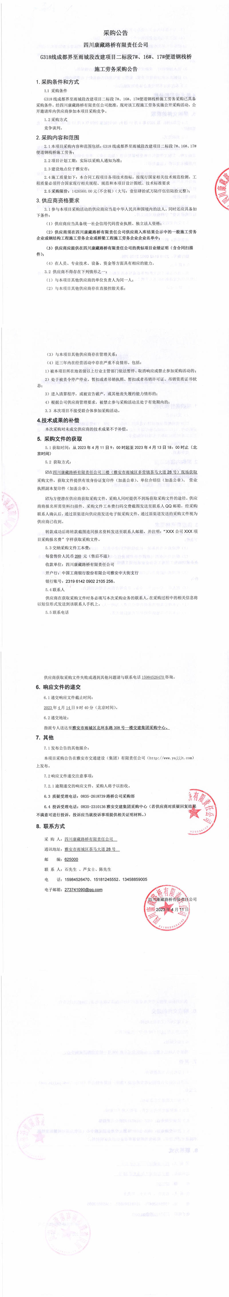 四川康藏路橋有限責(zé)任公司G318線成都界至雨城段改建項目二標段7#、16#、17#便道鋼棧橋施工勞務(wù)采購公告