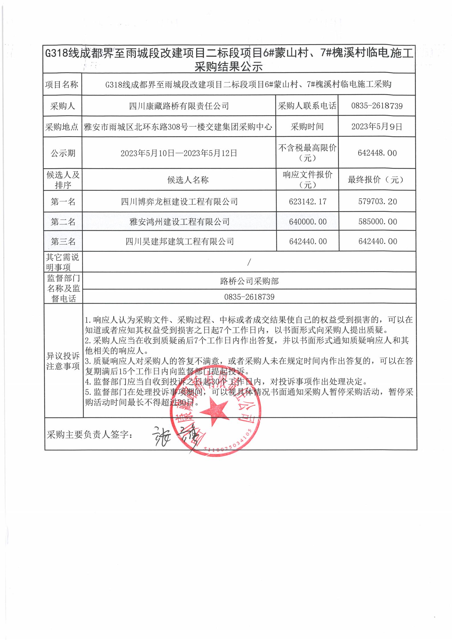 四川康藏路橋有限責(zé)任公司G318線成都至雨城段改建項(xiàng)目二標(biāo)段項(xiàng)目6#蒙山村、7#槐溪村臨時電施工采購結(jié)果公示