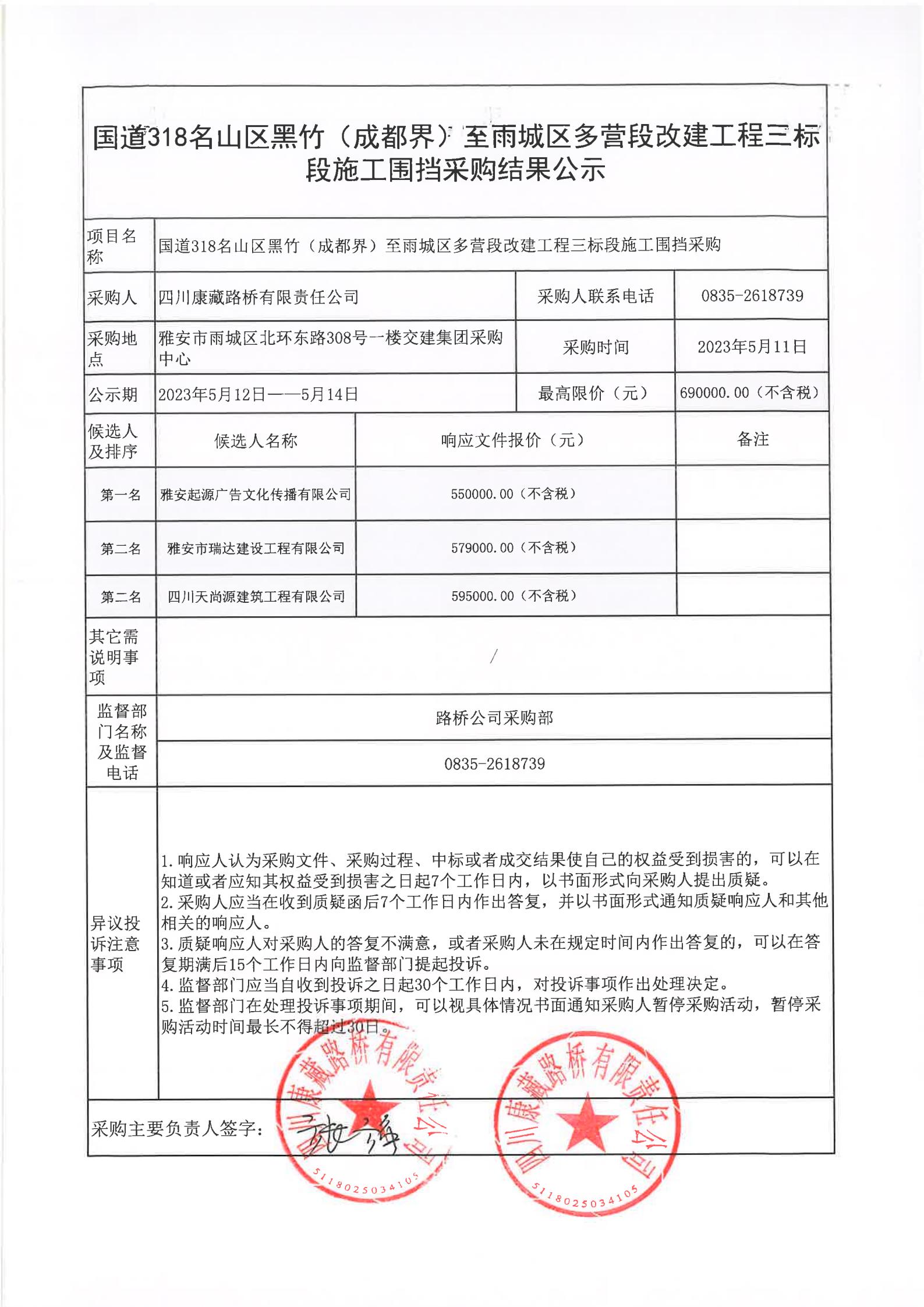 四川康藏路橋有限責(zé)任公司國道318名山區(qū)黑竹(成都界)至雨城區(qū)多營(yíng)段改建工程三標(biāo)段施工圍擋采購結(jié)果公示