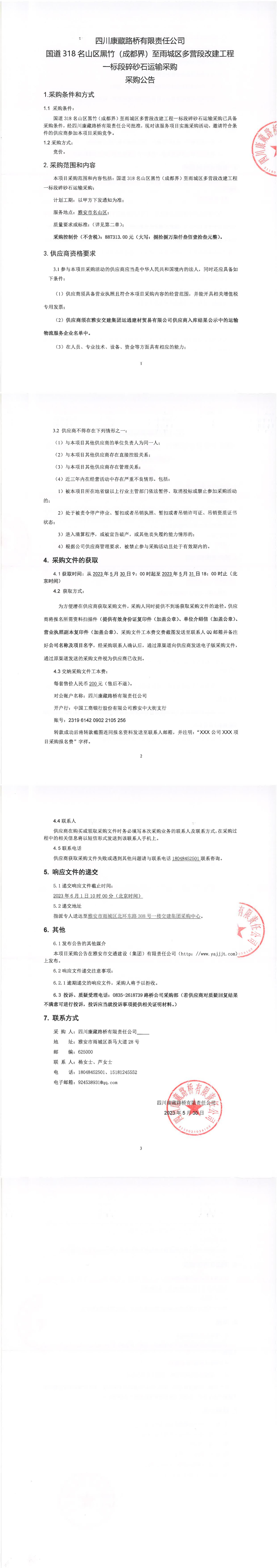 四川康藏路橋有限責(zé)任公司國道318名山區(qū)黑竹(成都界)至雨城區(qū)多營段改建工程一標(biāo)段碎砂石運(yùn)輸采購公告