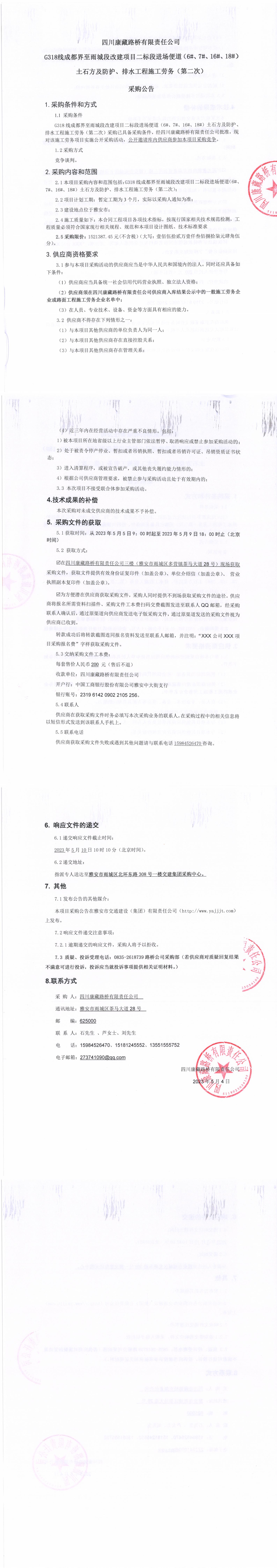 四川康藏路橋有限責(zé)任公司G318線成都至雨城段改建項(xiàng)目二標(biāo)段進(jìn)場便道(6#、7#、16#、18#)土石方及防護(hù)、排水工程施工勞務(wù)(第二次)采購公告