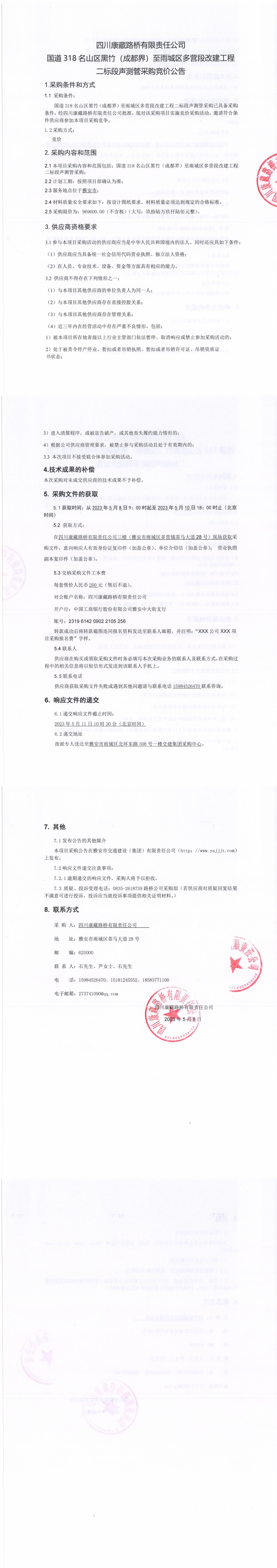 四川康藏路橋有限責(zé)任公司國(guó)道318名山區(qū)黑竹(成都界)至雨城區(qū)多營(yíng)段改建工程二標(biāo)段聲測(cè)管采購(gòu)競(jìng)價(jià)公告