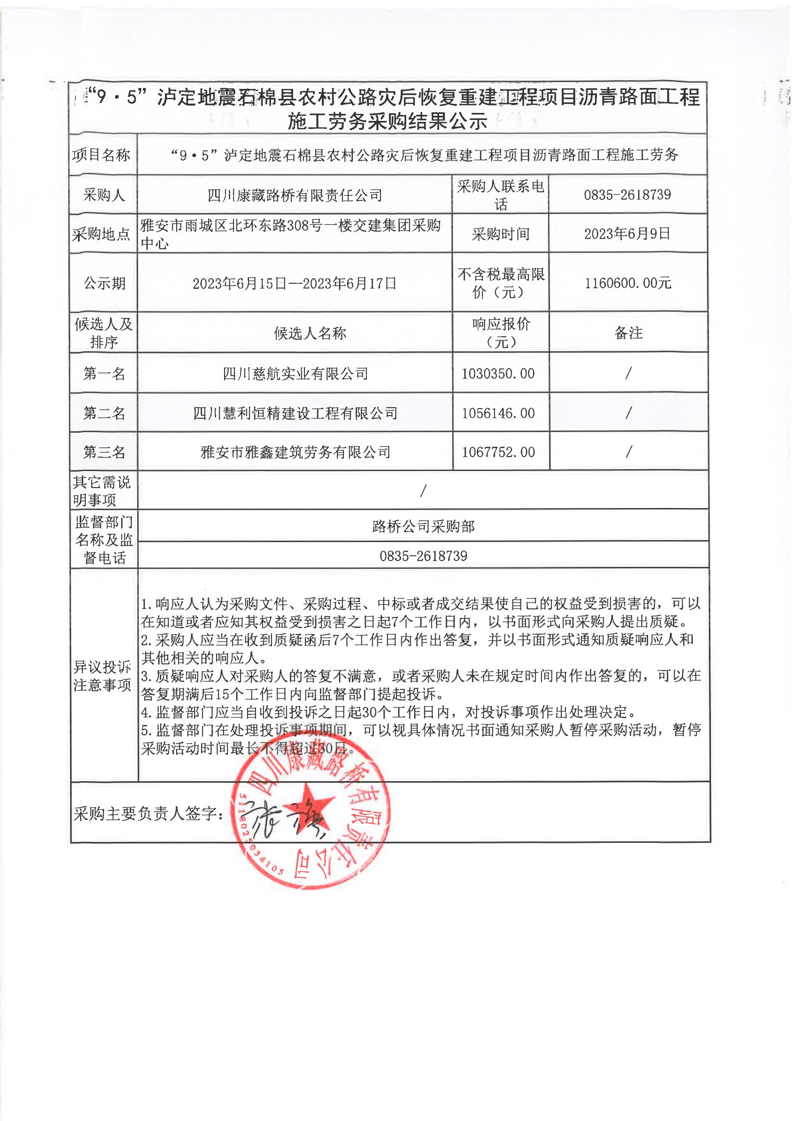 四川康藏路橋有限責任公司“9·5”瀘定地震石棉縣農(nóng)村公路災后恢復重建工程項目瀝青路面工程施工勞務采購結果公示