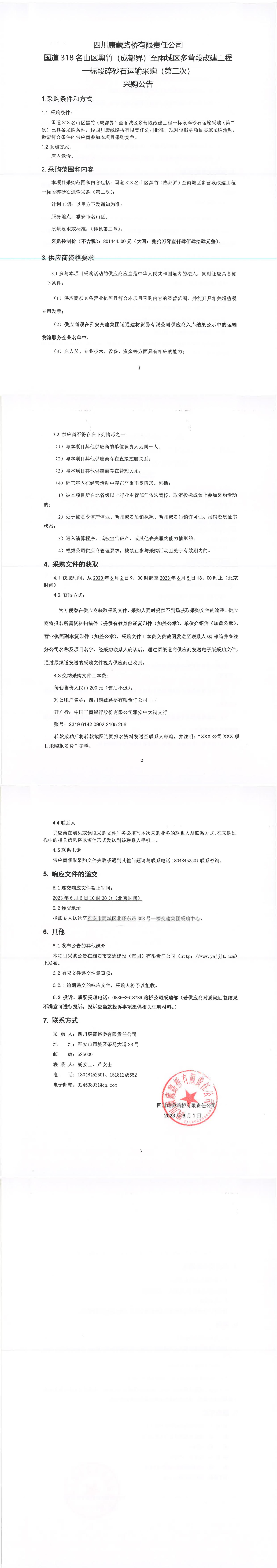 四川康藏路橋有限責(zé)任公司國道318名山區(qū)黑竹(成都界)至雨城區(qū)多營段改建工程一標(biāo)段碎砂石運輸采購(第二次)采購公告