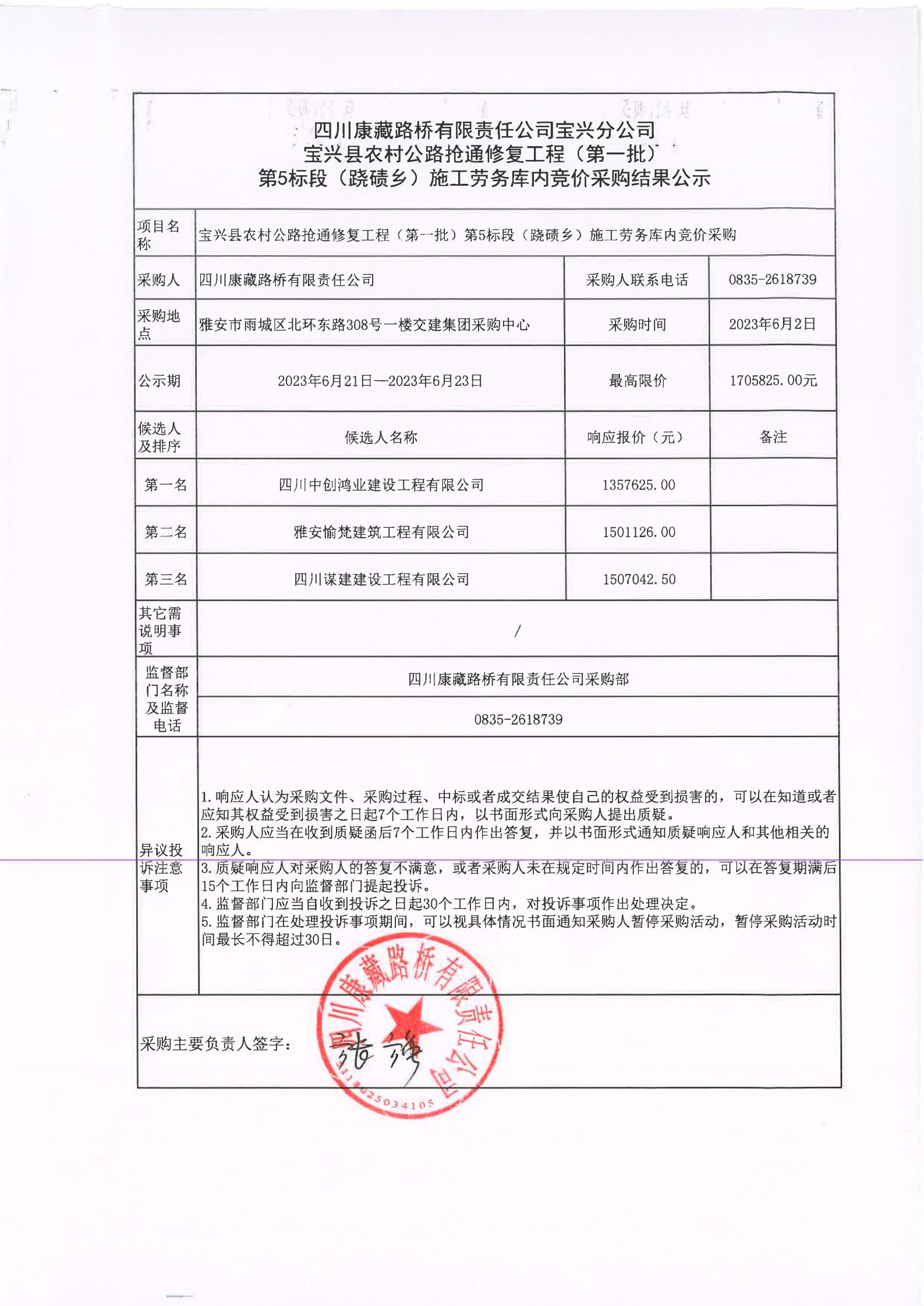 四川康藏路橋有限責(zé)任公司寶興分公司寶興縣農(nóng)村公路搶通修復(fù)工程(第一批)第5標(biāo)段(蹺磧鄉(xiāng))施工勞務(wù)庫(kù)內(nèi)競(jìng)價(jià)采購(gòu)結(jié)果公示