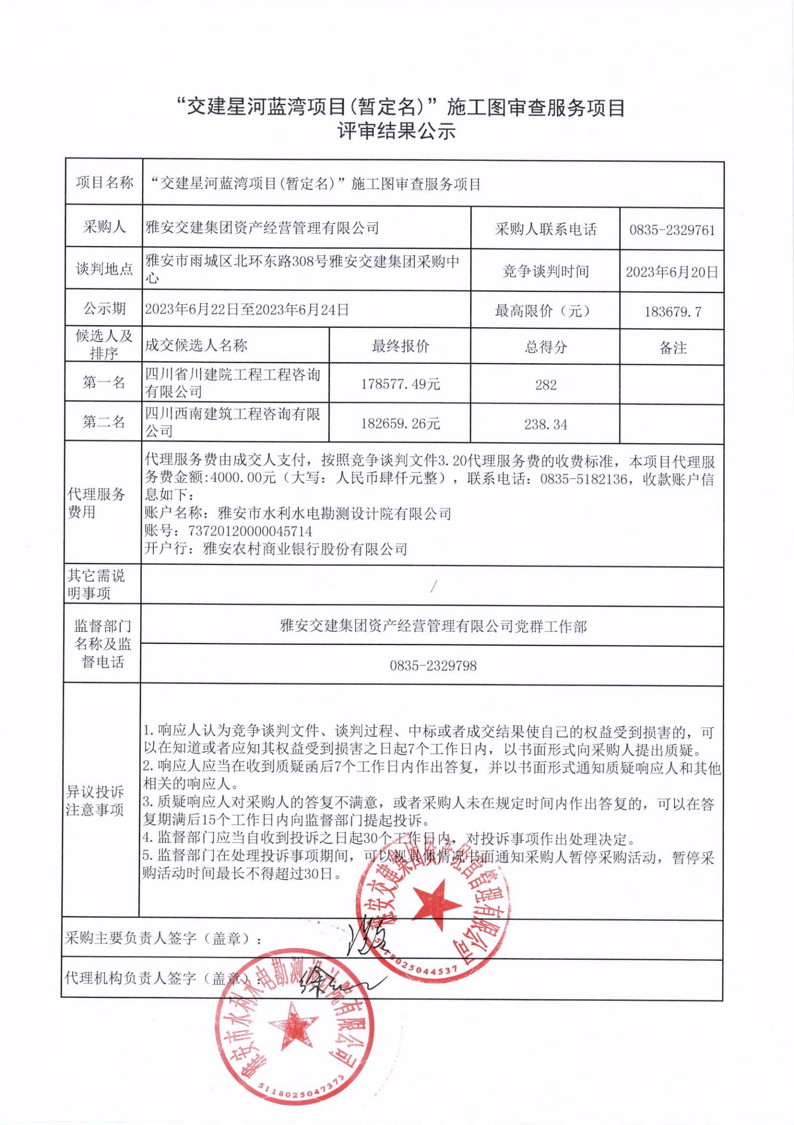 雅安交建集團資產(chǎn)經(jīng)營管理有限公司“交建星河藍灣項目(暫定名)”施工圖審查服務項目評審結果公示