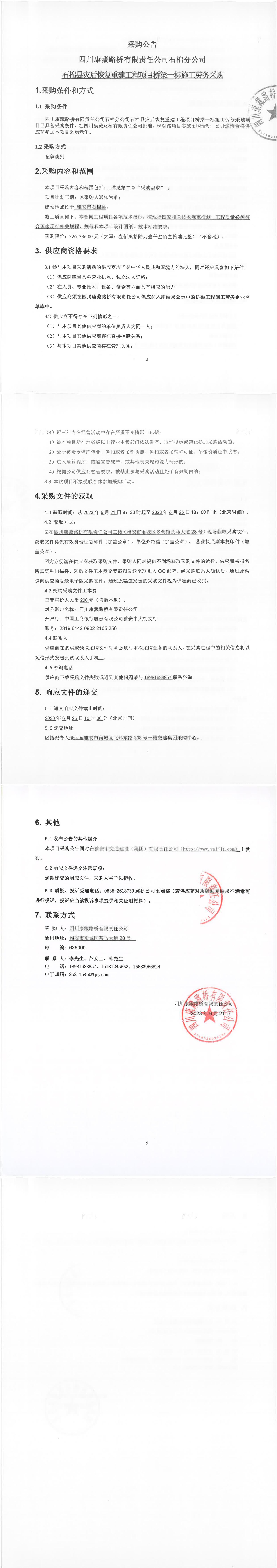 四川康藏路橋有限責任公司石棉分公司石棉縣災(zāi)后恢復重建工程項目橋梁一標段施工勞務(wù)采購公告