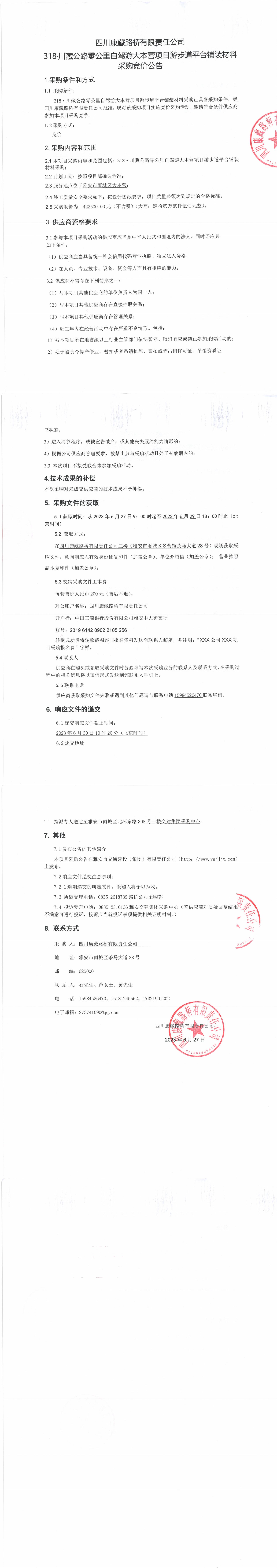 四川康藏路橋有限責(zé)任公司318·川藏公路零公里自駕游大本營(yíng)項(xiàng)目步游道平臺(tái)鋪裝材料采購競(jìng)價(jià)公告