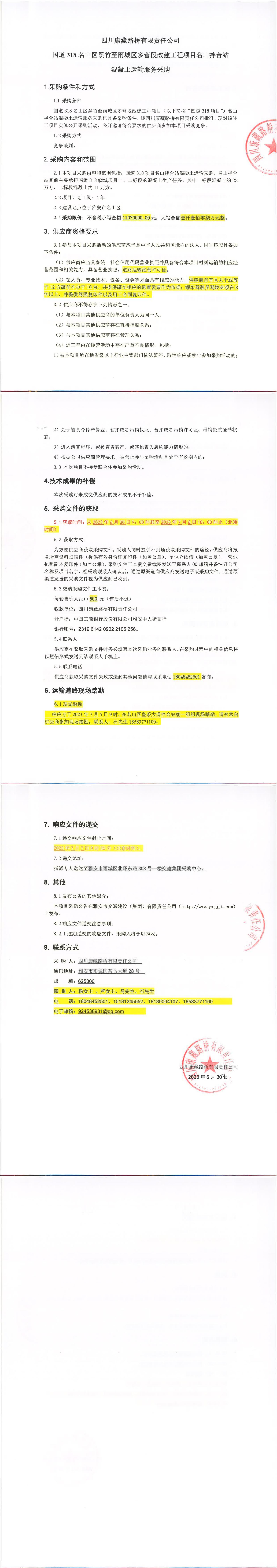 四川康藏路橋有限責(zé)任公司國道318名山區(qū)黑竹至雨城區(qū)多營段改建工程項(xiàng)目名山拌合站混凝土運(yùn)輸服務(wù)采購