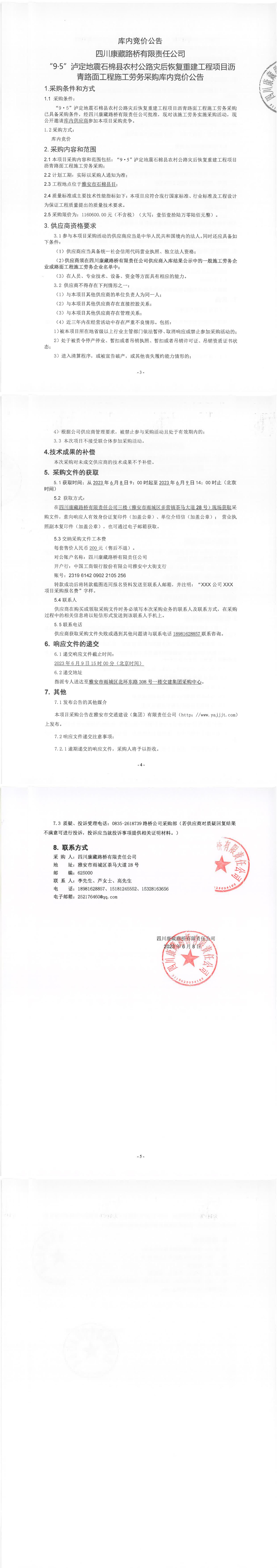 四川康藏路橋有限責(zé)任公司“9·5”瀘定地震石棉縣農(nóng)村公路災(zāi)后恢復(fù)重建工程項目混凝土路面工程施工勞務(wù)采購庫內(nèi)競價公告