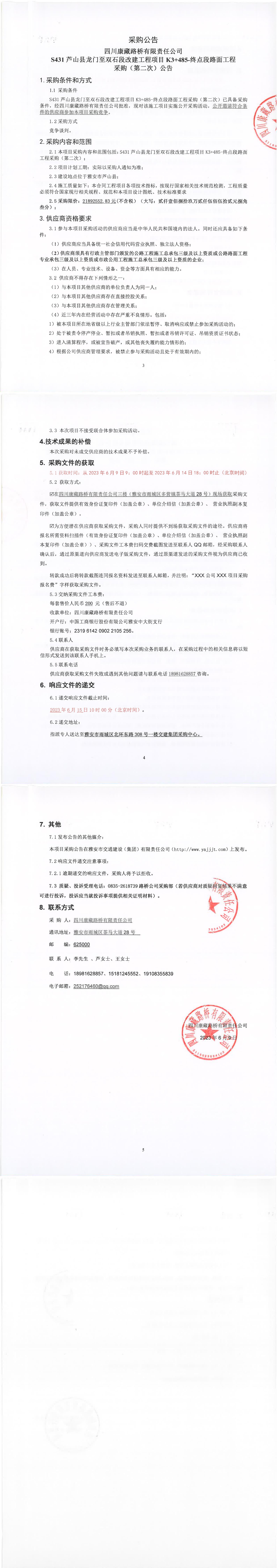 四川康藏路橋有限責任公司S431蘆山縣龍門至雙石段改建工程項目K3+485-終點段路面工程采購(第二次)公告