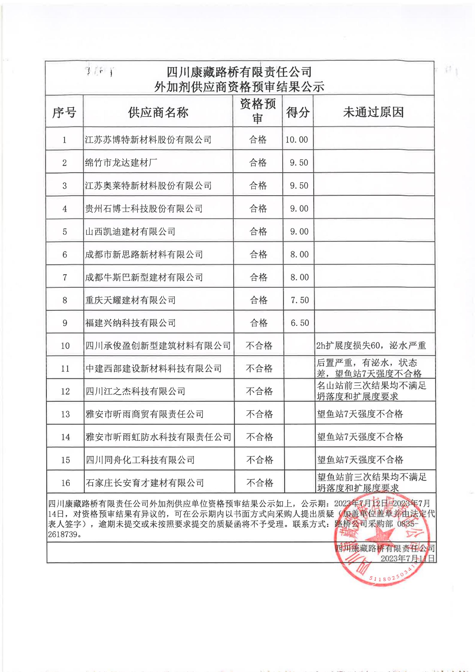 四川康藏路橋有限責(zé)任公司外加劑供應(yīng)商資格預(yù)審結(jié)果公示