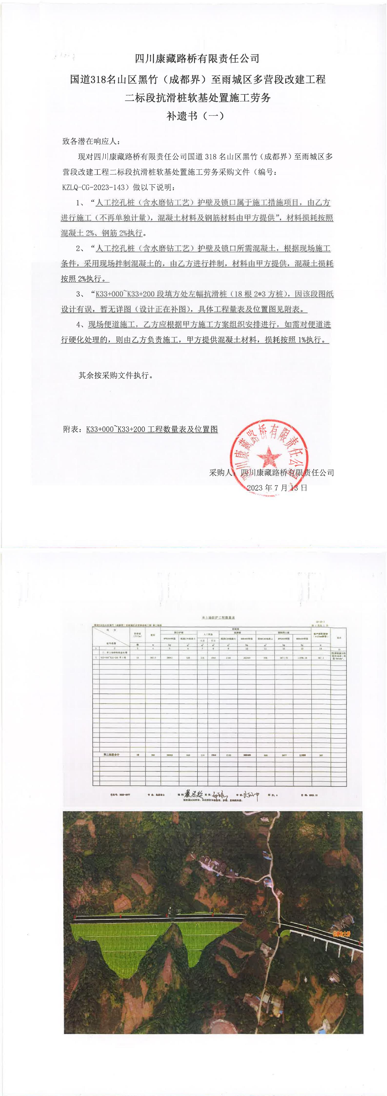 四川康藏路橋有限責任公司國道318名山區(qū)黑竹(成都界)至雨城區(qū)多營段改建工程二標段抗滑樁軟基處置施工勞務補遺書(一))
