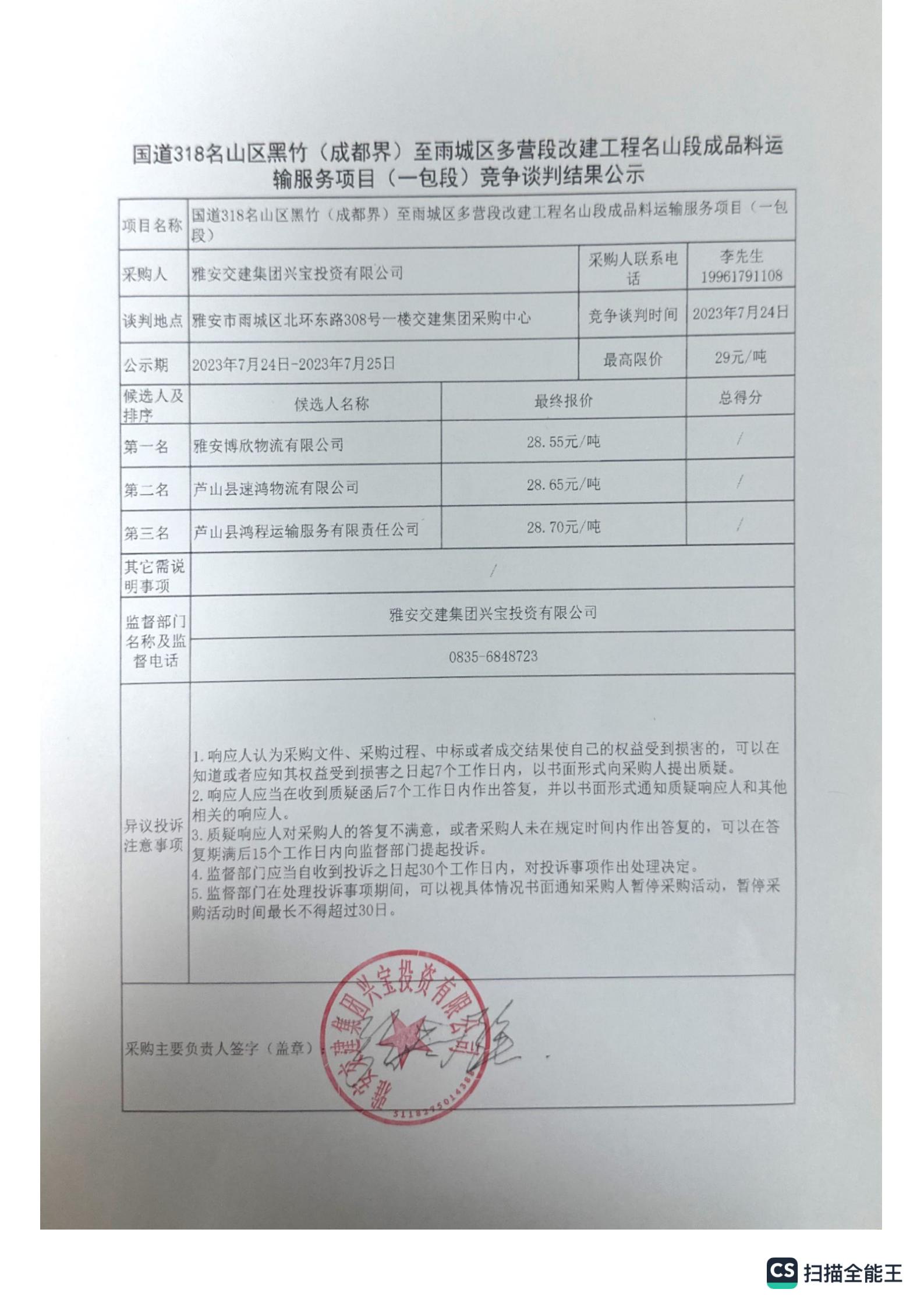 雅安交建集團(tuán)興寶投資有限公司國道318名山區(qū)黑竹(成都界)至雨城區(qū)多營段改建工程名山段成品料運(yùn)輸服務(wù)項目(一包段)競爭談判結(jié)果公示