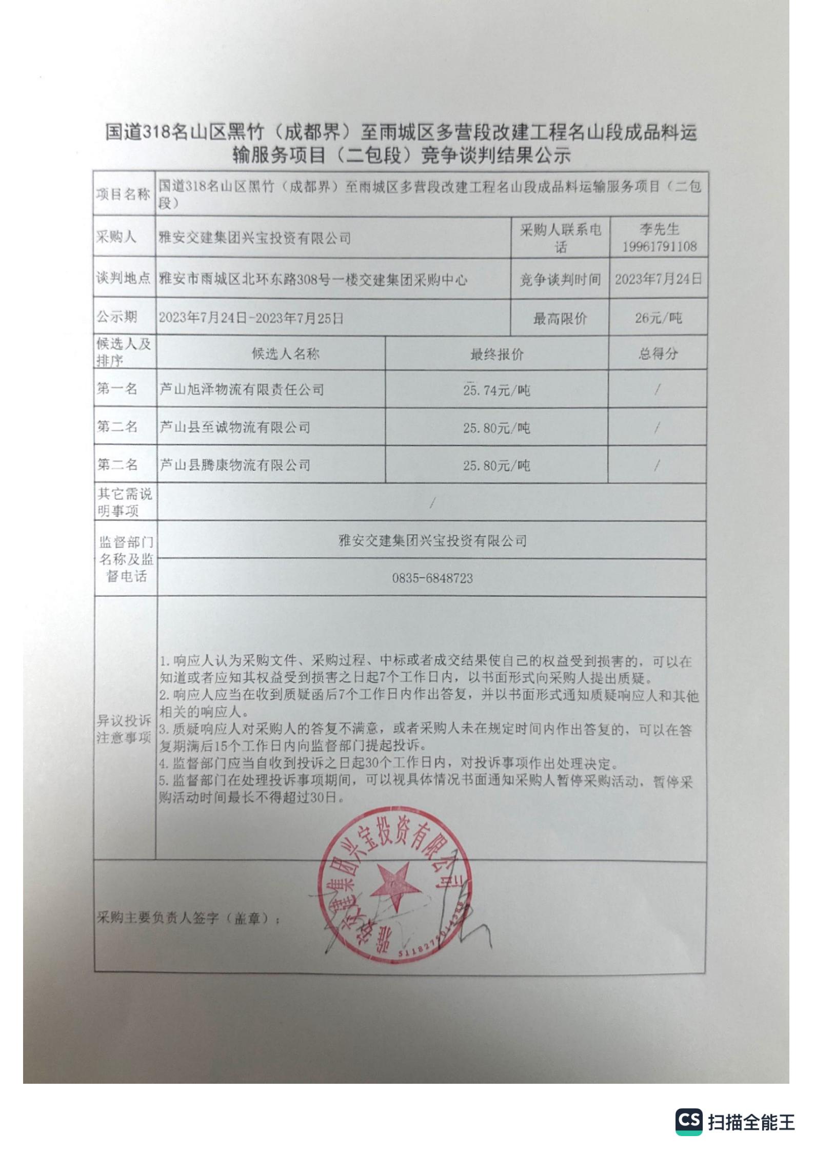 雅安交建集團興寶投資有限公司國道318名山區(qū)黑竹(成都界)至雨城區(qū)多營段改建工程名山段成品料運輸服務(wù)項目(一包段)競爭談判結(jié)果公示