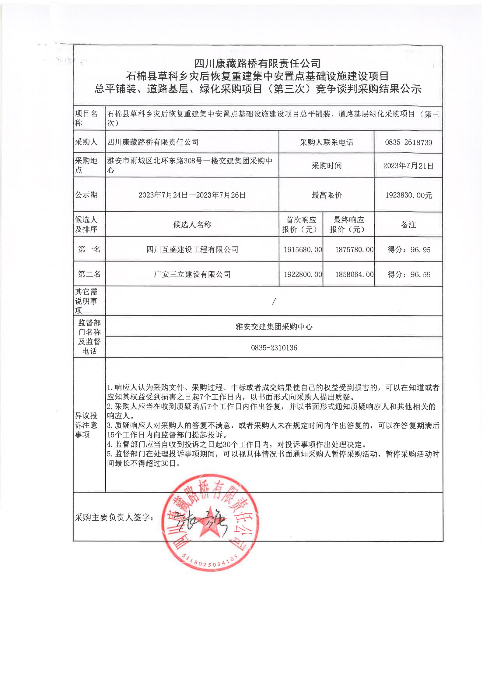 四川康藏路橋有限責任公司石棉縣草科鄉(xiāng)災后恢復重建集中安置點基礎設施建設項目總平鋪裝、道路基層、綠化采購項目(第三次)競爭談判采購結(jié)果公示