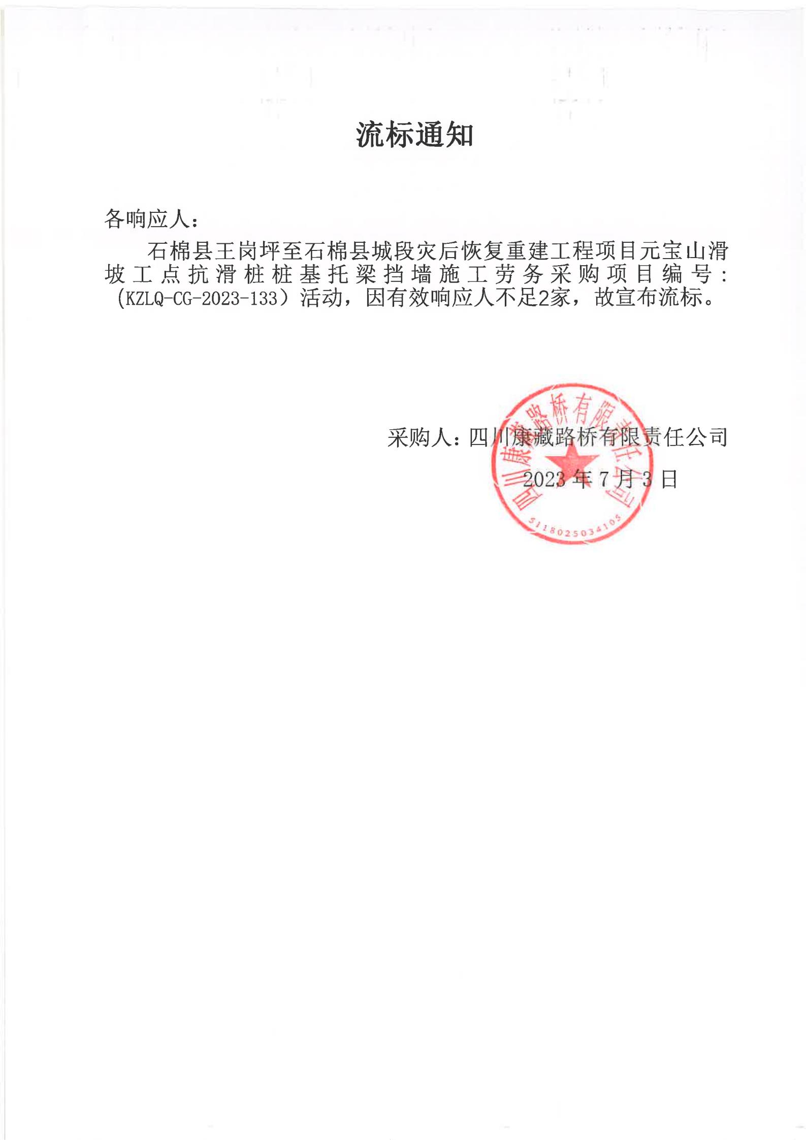 四川康藏路橋有限責(zé)任公司石棉縣王崗坪至石棉縣城段災(zāi)后恢復(fù)重建工程項(xiàng)目元寶山滑坡工點(diǎn)抗滑樁樁基托梁擋墻施工勞務(wù)采購(gòu)流標(biāo)通知