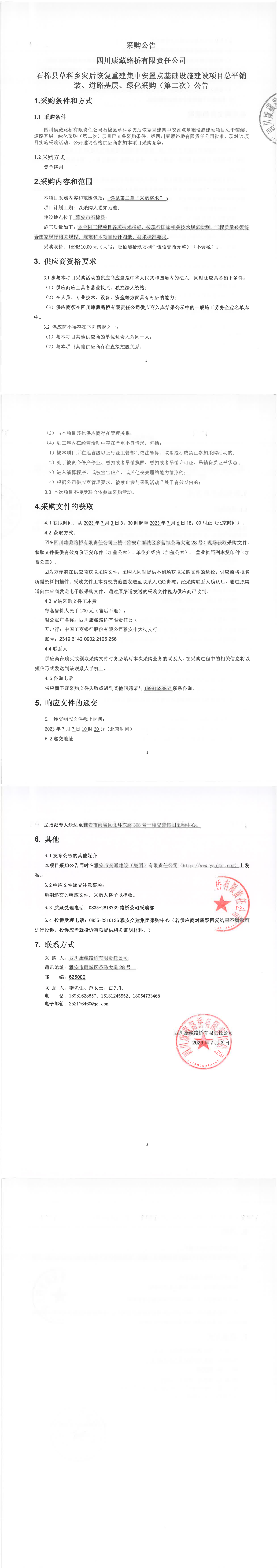 四川康藏路橋有限責任公司石棉縣草科鄉(xiāng)災后恢復重建集中安置點基礎設施建設項目總平鋪裝、道路基層、綠化采購(第二次)公告