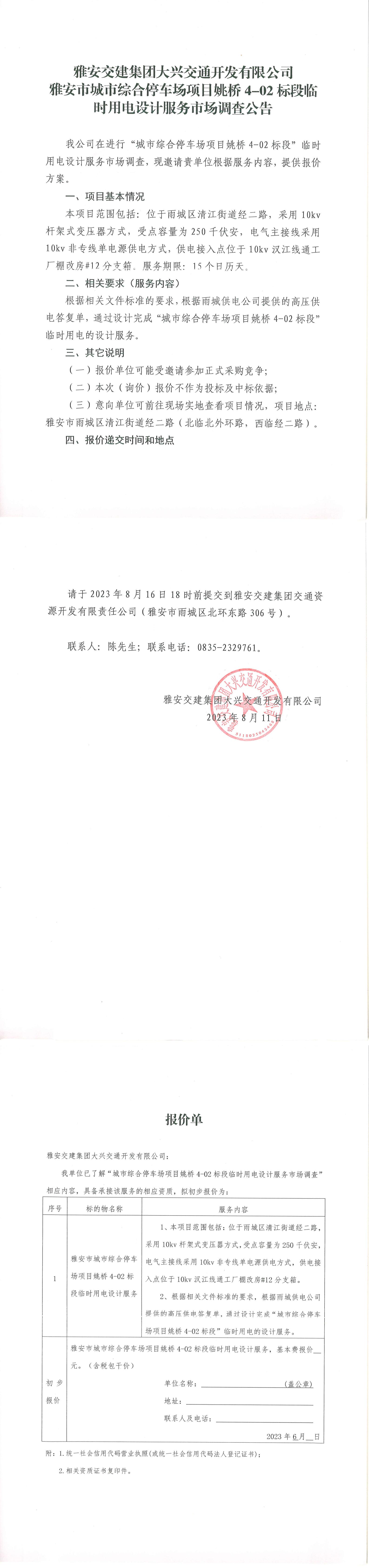雅安交建集團大興交通開發(fā)有限公司雅安市城市綜合停車場項目姚橋4-02標(biāo)段臨時用電設(shè)計服務(wù)市場調(diào)查公告